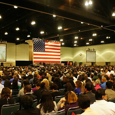 How the Immigration and Nationality Act of 1965 forever changed America and seeded today's immigration debate. Picture: Immigrants at a mass citizenship ceremony at the Los Angeles Convention Centre. Along with swearing their allegiance to the United States, the new citizens watch a video by President Obama welcoming them. Credit: Saul Gonzalez