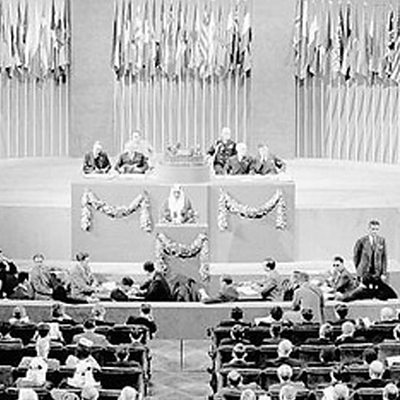 In October 1945, countries ratified the founding charter of a new organsation, the United Nations, that it was hoped would ensure there was never a world war again. Earlier that year thousands of delegates from around the world had met in San Francisco to hammer out the charter. Witness talks to two people who worked for the UN that year; and to historian Stephen Schlesinger. Photo: a delegate from Saudi Arabia addresses the UN's founding conference in San Francisco (Credit: the UN)