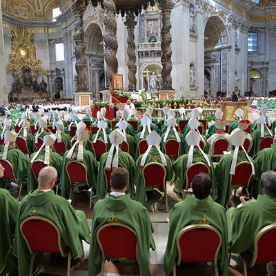 Pope Francis has brought together nearly 300 bishops from all over the world for a special Synod on the Family. He has asked them to speak frankly and with courage about his Church’s most divisive teachings – those that affect the sex lives of more than billion people. The stakes are high. Just calling the synod has raised hopes among liberal Catholics, who would like Rome to relax its teachings on homosexuality, birth control and divorce and remarriage. But will the reformers succeed given that the Church’s new powerhouse is Africa, where many believers want their bishops to uphold tradition and doctrine? In the final episode, Helen Grady travels to Rome to try to understand what is happening inside the Synod. All the key meetings take place behind closed doors, so it’s not obvious what the bishops are talking about or which way the debate is heading. Helen speaks to bishop delegates from Ireland, Nigeria, Australia and Algeria and gets their take on what is happening in the surprisingly modern conference room where the Synod meets every day. And she tries to find a way through the spin and intrigue that are part and parcel of reporting on the Vatican. Interviewees include: Archbishop of Armagh, Eamon Martin; Archbishop of Kaduna, Matthew Man’oso Ndagoso; Bishop of Oran, Jean-Paul Vesco; Archbishop of Syndey, Cardinal George Pell; and Christopher Lamb, Rome correspondent for the international Catholic magazine The Tablet. (Photo: Pope Francis celebrates the closing Mass of the XIV Ordinary Meeting of the Synod of Bishops in the Saint Peter"s Basilica. Credit: EPA)