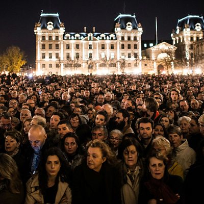 Memorial ceremony at Notre Dame; a musician's tale of survival; the Belgian connection (Photo: People gather outside Notre Dame Cathedral in Paris Credit: Getty Images)