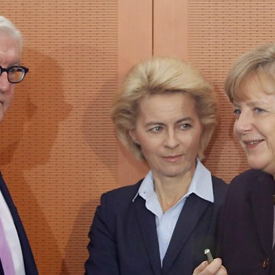 Germany plans to join anti-IS mission; Man City's China deal; Public Enemy hitch a ride. (Photo: Germany"s Foreign Minister Steinmeier, Defence Minister von der Leyen and Chancellor Merkel. Credit: Reuters)