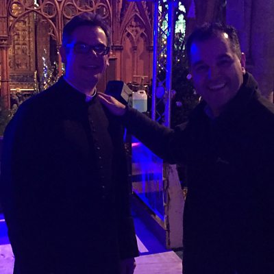 Father Stuart Craddock has installed a synthetic ice rink in his church in the run-up to Christmas in the hope of getting more people through the door. St Wulfram's Church in Lincolnshire, which dates from the 1300s, is also decorated with more than a hundred Christmas trees. Danny Savage put his skates on to find out more. (Photo: Father Craddock and reporter Danny Savage on their skates. Credit: BBC)