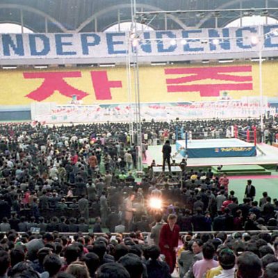In 1995, the Japanese wrestler, Antonio Inoki, organised an international tournament in secretive North Korea. Featuring wrestling stars from Japan and America, the Collision in Korea was an attempt to foster peace through sport and attracted crowds in the hundreds of thousands. Ashley Byrne reports. The programme is a Made-in-Manchester Production. (Photo: The crowd at the Collision in Korea in Pyongyang. Credit: Getty Images).