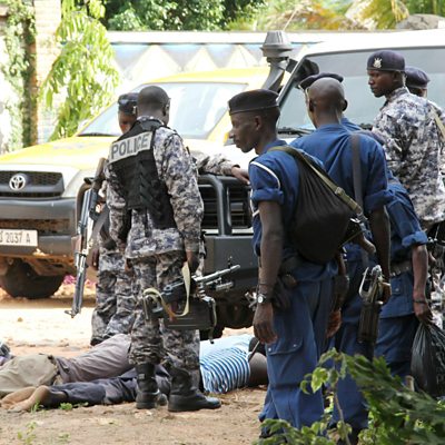 Burundi violence: army interview; Missing Chinese billionaire; Lord Stern on climate change. Picture shows Burundian military and police in Bujumbuar frisking suspects. (Credit: Jean Pierre Harerimana/reuters)