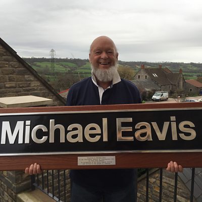 Michael Eavis and Charlie look at the old railway line which crosses Glastonbury Festival