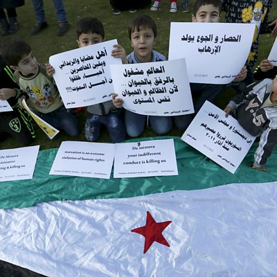 A Syrian opposition activist describes day-to-day for those living in the besieged rebel-held village of Madaya. Photo: children carry placards as they call for the lifting of the siege off Madaya and Zabadani in Syria; Credits: Jamal Saidi/ Reuters.