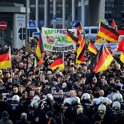Reporter Hugh Sykes hears from attendees at Pegida and anti-racism demonstrations in Cologne in the aftermath of assaults on women in a number of German cities on New Year's Eve. The report starts with Kirsten Tsabesla, a local doctor appalled by what happened but who insists the response must be measured, not emotional. (Photo:Right-Wing Groups Rally Following Cologne Sex Attacks, Credit: Getty Images)