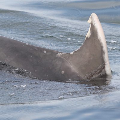 Marine scientist Barbara Cheney explains that because dolphins often fight and play together, their dorsal fins accumulate permanent scratches and tooth marks. These unique marks can be used to accurately identify individual dolphins, and are a non-invasive alternative to radio tagging. Image: This is one of the photos Barbara took of the dolphin known as Jigsaw during our recording.