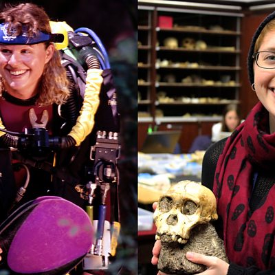 Jill Heinerth is the world's top underwater cave explorer. More people have walked on the moon than have ventured to some of the places she has dived. Originally from Canada, and now living in Florida in the US, Jill has broken records mapping whole water courses underground, and once had a narrow escape from cave-diving in an Antarctic iceberg. She takes photographs and video whilst underground, and says that she would never attempt a dangerous dive just for the thrill of it - there has to be a new discovery to pursue. Elen Feuerriegel is a PhD student from Australia who was catapulted into one of the most exciting scientific discoveries of our time, when her caving experience and slim build led to her joining the Rising Star Expedition. This all-women team excavated over a thousand fossils from a deep cave system in South Africa, which at its narrowest point measures just 18 cm. It was announced in September 2015 that these bones were from a previously unknown species of human ancestor, Homo Naledi. (Photo: (L) Jill Heinerth in diving gear, Credit: Wes Skiles. (R) Elen Feuerriegel holding MH1)