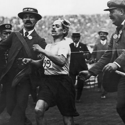 In 1908, hundreds of thousands of Londoners crowded the streets to watch the dramatic events of the Olympic marathon. Dorando Pietri, an Italian sweet-maker from Capri, was first into White City Stadium but he collapsed and had to be helped to the line. He was consequently disqualified and Johnny Hayes of the USA was declared the winner. However, with their love of a gallant loser, the disqualification made Pietri a celebrity for British people and he was greeted with cheers wherever he went. Simon Watts tells his story through newspaper reports from the time. Picture: Dorando Pietri crosses the line, Credit: Hulton Archive/Getty Images