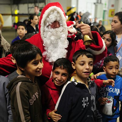 Despite difficult living conditions, Ehtesam, a refugee housed in a former office block in Berlin, says Syrians in Germany should be thankful for the new opportunity given them by Chancellor Angela Merkel to become German citizens. Image: A Syrian migrant dressed as Santa Claus greets children at a shelter for migrants and refugees in Sarstedt, Germany. Credit: Alexander Koerner/Getty Images.