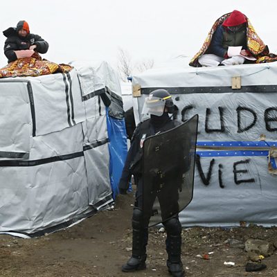 Tear gas and clashes in the migrant camp; Prosecuting destruction of heritage as a war crime; Health professionals at the heart of town planning. (Photo: Migrants sit on the roof of their makeshift shelters as police secure the Jungle migrant camp during its demolition in Calais. Credit: Yoan Valat/EPA)