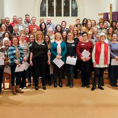 Tenor Wynne Evans & Good Morning Wales presenter Oliver Hides have an impromptu sing-song with Nottingham's 'Tuneless Choir'