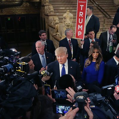 What can history tell us about the likelihood of a Trump presidency?; Following the Russians in Northern Syria; New cancer discovery. (Photo: Republican presidential candidate Donald Trump greets reporters in the spin room following a debate sponsored by Fox News at the Fox Theatre on March 3, 2016 in Detroit, Michigan. Credit: Chip Somodevilla/Getty Images)