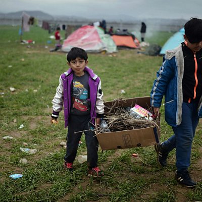 The former foreign secretary has called on the European Union to establish an "organised and orderly" process for refugees and migrants arriving in Europe. David Miliband, who heads the charity the International Rescue Committee, was speaking to Eddie Mair on Radio 4's PM programme as EU and Turkish leaders held talks in Brussels to try to agree an action plan on migrants. He said that until "safe and legal" routes were established from the Middle East to Europe the EU would "always be playing catch up" with people smugglers. (Image: Children carry kindling in the makeshift camp at the Greek-Macedonian border. Credit: AFP/Getty Images)