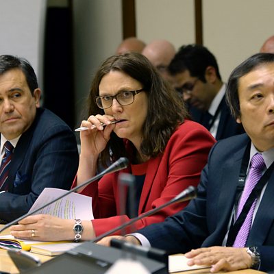 Ministers and industry leaders from about thirty countries say they have had frank discussions about how to tackle the over-production of steel. China has been accused of causing prices to collapse by flooding international markets with cheap steel. We hear why China says it isn't to blame. The Managing Director of the IMF, Christine Lagarde takes questions on the global economy at a BBC-hosted Q&A session in Washington, DC. An investigation into the use of slave labour in Southeast Asia to supply seafood to the United States and elsewhere has won the Pulitzer Prize for public service, one of the most prestigious awards in American journalism. (Photo: Mexican Economy Minister Ildefonso Guajardo Villarreal, European Union Commissioner for Trade Cecilia Malmstrom and Japanese Vice Minister for International Affairs Takayuki Ueda at the steel talks in Belgium. Credit: Thierry Charlier/AFP/Getty Images.)