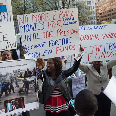 We examine a shocking corruption scandal: how millions of dollars earmarked to help the survivors of Sierra Leone's lethal Ebola outbreak may have been stolen by government officials. As well as the thousands who lost their lives, millions more have lost their livelihoods in the west African outbreak, We hear a report from the region, and from a local anti-corruption official who says the government appears to have given up finding the culprits or recovering the cash. Also, with the Zika virus now threatening millions more across Latin America, we ask Dr Scott Gottlieb of the American Enterprise Institute, whether the global health lessons of Ebola, from public health responses to the development of vaccines, have really been learned. (Opponents of Sierra Leone President Ernest Bai Koroma demonstrate outside World Bank headquarters following a meeting on the Ebola crisis in Washington in April 2015. Credit: Nicholas Kamm//AFP/Getty Images)
