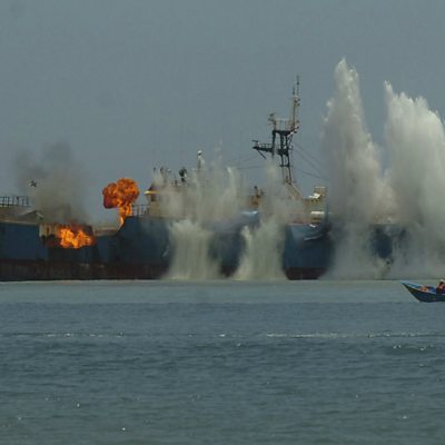 Fish are a vital source of protein around the world, but there are ever more fishermen chasing ever fewer fish. Most wild fisheries are at, or near, breaking point and it is estimated up to a third of all fish are caught illegally, feeding an underworld of crime. We find out how the growing pressure is leading to violent clashes on the high seas and joins an Indonesian coastguard patrol chasing and shooting vessels out of their waters. We ask Interpol how it is trying to police the oceans and find out how illegal fishing is tied up with a criminal underworld of drugs and human trafficking. Plus, experts tell us what consumers should look out for, and we discover fish farming may not be the answer to the problem. (Photo: The Indonesian Navy blows up the illegal fishing vessel the MV Viking in the waters of Tanjung, West Java, 2016. Credit: Antara Foto, Reuters)
