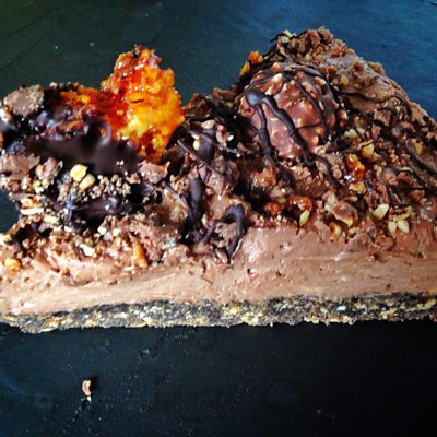 Ingredients: Base: 150g ginger biscuits 120g chocolate Oreo cookies 120g soft butter 2 x Ferrero Rocher Filling: 60g icing sugar, sifted 600g cream cheese 250g mascarpone 400g chocolate hazelnut spread Topping: Several Ferrero Rocher 50g whole hazelnut milk chocolate bar For the honeycomb: 100g caster sugar 4 tablespoons golden syrup 1 & 1/2 teaspoons bicarbonate of soda Dark chocolate, melted Method: 1: Combine all the base ingredients in a food processor and blitz together to make crumbs. Press the crumbs evenly into the base of a buttered spring form cake tin (23cm diameter) and put in the fridge to chill. 2: Combine the cream cheese, mascarpone and icing sugar in a big bowl using an electric whisk, then add all the chocolate spread and whisk until fully incorporated. 3: Spread filling evenly over the biscuit base then press the Ferrero Rocher into it. 4: Put the hazelnut milk chocolate into the processor and blitz to crumbs, sprinkle over the topping but reserve some for later. 5: Line a roasting tin with some baking parchment. Put the caster sugar and golden syrup in a saucepan and mix well then place on a medium heat but DO NOT STIR once on the heat, simply swirl the pan to incorporate everything. Once it is all liquid and starts to bubble watch it carefully until it darkens slightly to the colour of maple syrup, this won’t take long. Be careful not to allow it to darken too much as it will taste bitter. 6: Once the colour has darkened a bit, remove the saucepan from the heat and add the bicarbonate of soda and whisk in quickly. Then quickly pour into your prepared roasting tin, remember to be careful as it is extremely hot at this point! 7: Allow the honeycomb to cool completely then dip in the melted chocolate and scatter over the remaining chocolate hazelnut mix then place all over the cheesecake. 8: Refrigerate for at least 4 hours and serve straight from the fridge.