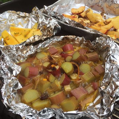 Ingredients: • 4 sticks rhubarb • Sprinkle of demerara sugar • Handful of sultanas • Drizzle of honey • Splash of orange juice and orange zest Cut the rhubarb up into 1 inch pieces. Make a foil parcel and lay the rhubarb on the foil. Sprinkle with the remainder of the ingredients and bbq in the foil until soft and bubbling. Enjoy with ice cream, crème fraiche or cream. Caramelized Peaches with lemons and blueberries: • 4 large peaches, firm but ripe, halved and pitted • 3 tablespoons unsalted butter, cut into small pieces • 2 tablespoons dark brown sugar • 1⁄2 teaspoon pure vanilla extract • 6 tablespoons store-bought lemon curd • 2 -4 tablespoons heavy cream • 1 1⁄2 cups fresh blueberries 1. Arrange the peaches in a single layer, cut sides down, in a 9-by-13-inch, heavy-duty foil pan. Scatter the butter pieces and sugar between the peaches. Add the vanilla to the pan. 2. In a small bowl, whisk the lemon curd with enough heavy cream to create a smooth, spoonable sauce. 3. Place the pan of peaches over direct medium heat and cook, with the lid closed as much as possible, until the peaches are tender, warm and glazed, 8 to 12 minutes (depending on the size and firmness of the peaches), rolling the peaches gently in the butter mixture once. To keep the peaches warm, slide the pan over indirect heat and remove the grill's lid. When ready to serve, slide the hot pan onto a baking sheet and move to a work surface. 4. Cut the peaches into quarters or smaller slices. Arrange in bowls with the blueberries. Serve warm with the lemon curd spooned over the top. Mango with Mint and Lime: • 1 mango • 1 Lime • Sprig of mint Peel and thickly slice a not overly ripe mango. Brush with neutral oil and grill on the bbq until soft, sprinkle with mint and lime juice. Serve.