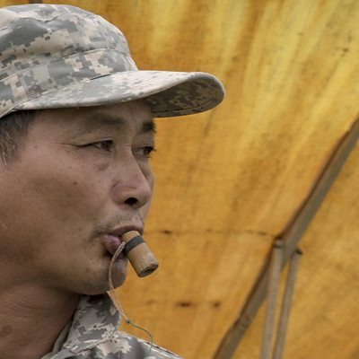 Jin Weiguo, the bird trapper of Chongming Island. He switched from hunting shorebirds for the pot to catching them for conservation science. For more than 40 years, Jin Weiguo has hunted shorebirds on Chongming Island, near Shanghai. In the last decade, Mr Jin has caught birds only for conservation research as an employee of Chongming Dongtan Nature Reserve. The birds are fitted with ID bands and flags so their lives and fortunes can be tracked by scientists from Russia to Australia. His traditional trapping method includes imitating the calls of the many wader species which migrating through the reserve. He mimics them on a bamboo whistle. With bird book in hand, Ann Jones asks Mr Jin to run through part of his repertoire. Credit: Ann Jones