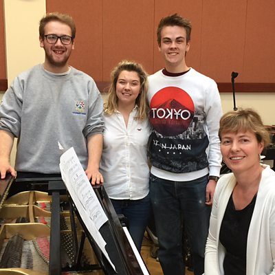 Peter, Katy and David with their music teacher Heather Montgomery from Dalriada School.