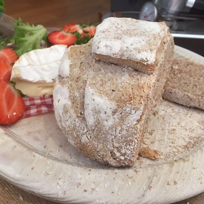 Friday Flatbreads: Ingredients: • 250g plain flour • 1tsp salt • 1 tablespoon olive oil • 150ml warm water Method: • Mix all ingredients together, knead until smooth, leave to rest for about half an hour. • Divide into six and roll out really thinly. • Cook in a hot frying pan or on a griddle for a couple of minutes on each side until they are cooked but not dry, and they should bubble up a bit. • Serve with dips or use as wraps for your favourite meat and veg or salad. Simple Wholemeal Sourdough - For the Week: • One week before you want to make your bread, make your starter. This you will need a large jar or container with a lid. • DAY 1 - Mix together 1 level tablespoon of wholemeal flour and 2 tablespoons of lukewarm water together in a sealable jar, seal and leave on your kitchen worktop overnight. • DAY 2, 3, 4 and 5 - Each morning, you will need 1 level tablespoon of wholemeal flour and 2 tablespoons lukewarm water. Mix these into the mixture in the jar and whisk really well, seal and leave overnight. • The starter will be ready to use after about a week. It should be bubby and very active, almost doubling in size overnight. If you are not going to use if for a while, you can pop it into the fridge so you don't have to keep feeding it. To rivive it, take it out a couple of days before you want to use it, pour off any separated liquid, discard half of hte remaining mixture and start to feed as before. It will soon be bubbly and active again. To make Sourdough bread: • The night before baking day, pour a large cupful of your starter into a large bowl, you don't have to be precise. Add 450g strong white flour and 550ml warm water, mix together really well, until there are no lumps. Leave this overnight, at normal room temperature, covered with damp tea towel or a plastic bag. • In the morning you will find a nice spongy bubbly mixture waiting for you. To this, add 550g strong wholemeal bread flour and 20g sea salt and mix really well and knead until smooth. The dough should be soft and a bit sticky, but able to hold a shape. You may need a little more flour or water. • Shape the dough into a ball, place into an oiled bowl, cover with a damp cloth and leave for 10 minutes. Then take it out of the bowl, give it a little 2 minute knead, shape into a ball and return to the bowl, cover and leave for another 10 minutes. Repeat this process once or twice more. • Divide the dough into 2 loaves and shape into rounds. Take a normal mixing bowl and a thin smooth cloth, linen is best, but most tea towels will be fine. Heavily dust the cloth with wholemeal flour, place your shaped dough, rough side down, onto it, then lift it into the bowl, sprinkle heavily with more flour, and cover with a damp cloth or a greased plastic bag. Leave on the side at normal room temperature, until doubled in size. This could take up to 4 hours, or the loaves could rise in an hour, depending on the warmth of the day, and the liveliness of your starter • When the loaves have doubled in size, preheat the oven to 200c, put your baking tray into the oven and when it is hot, take the tray out, sprinkle heavily with flour, quickly turn out your loaves and carefully or haphazardly make some slashes in the dough. The slashes help the dough to expand, but also act as decoration. Bake for 30 to 50 minutes until the loaves sound hollow when tapped. Place the loaves on a cooling rack and try to resist eating it until it is cool, or don't! Enjoy your wild bread! (Makes two large loaves)