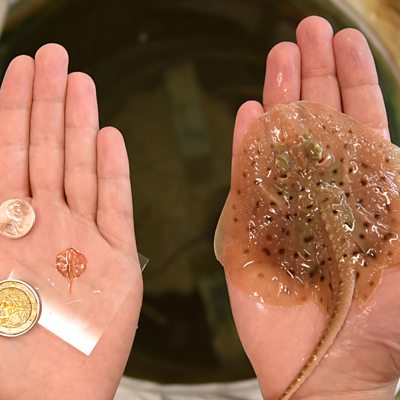 Professor Kevin ‘Kit’ Parker explains the design of a miniature robotic stingray. Along with a gold skeleton and a gel-like biomaterial, it contains a single layer of hearts cells from a rat. These cardiac cells were engineered to be responsive to light. Using specific wavelengths as a guidance system, the robot is able to negotiate a small obstacle course. The motion of the stingray would help us understand how the human heart pumps blood and the resulting diseases. Photo: Tissue-engineered soft-robotic ray and a little skate, Leucoraja erinacea/Karaghen Hudson