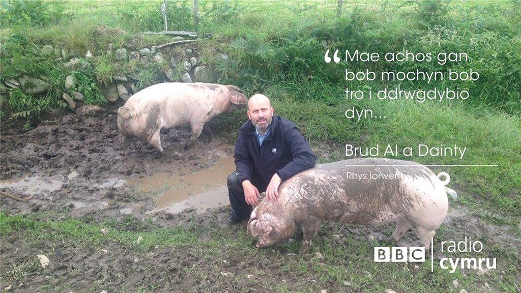 Mae achos gan bob mochyn bob tro i ddrwgdybio dyn, ond ein moch sy’n fudan mwy o fwd Môn i fwd Mynwy: pam yn Llanelwedd, meddwch, dewis hwn i dywys hwch? Al Huws? Oes ganddo leisans? Yna’r jôc: oes unrhyw jans y daw i ben â’r da byw? Boi radio’r beret ydyw! Bydd Dainty ni’n ei Hannwn wrth ddilyn y niws-ddyn hwn. Onid Aled yn rhedeg ar ei hôl yn tuchan rheg ydi’r un olygfa drom (un wir glasur) a glywsom? Hwn yn hastio’n anystwyth, hi’n taro rhech fel Twrch Trwyth? Ac er golchi’r tethi twt yn ffeind, er mai cynffondwt ydi Dainty cyn ei dydd, yn “waw” o binc o’r newydd, draw ar y llain, arwain hon i’r manure – y mae’n wirion. Iddi ei thwlc fydd ei thŷ; rwyt Al yn un o’r teulu ond am ei cherdded wedyn? Yn syber ddiawl, sobra ddyn – yn ynfyd mae sawl cenfaint yn eu dom gwlad am gael haint. Huwsi a Dainty eich dau: imi heddiw rhaid maddau ond proffwydaf, ofnaf i y baeddwch, ac y bydd-hi heb os (er teimlo drosoch) ar hyd y maes yn draed moch...