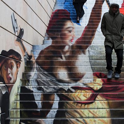 Graffiti’s modern role is evolving rapidly. From Europe to Brazil, street artists are displaying their anger about inequality, invisibility, corruption and control. Powerful images and words on walls are creating international headlines. But can breaking one law help to change another? Where should the line be drawn between democracy and vandalism, vandalism and art? In an era of rapid political, social and economic change, graffiti in Paris and Barcelona has become more prolific – and less tolerated – than ever before. Artists including Blek Le Rat (the “father of stencil graffiti”), Roc Blackblock, Suriani and Vegan Bunnies defend their actions, and discuss whether such “freedom of expression” on walls should have any limits. Presented by Steve Urquhart. (Photo: People pass by an unfinished street art graffiti made in a stairway by French street artists Zag and Sia in Paris, 1 March 2016. Credit: Joel Saget/AFP/Getty Images)