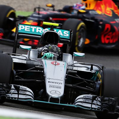 Mercedes' Nico Rosberg is informed by his team he has to serve a five second penalty for running Red Bull's Max Verstappen off the circuit earlier in the race. This clip is originally from 5 live Sport on Sunday, 31 July 2016