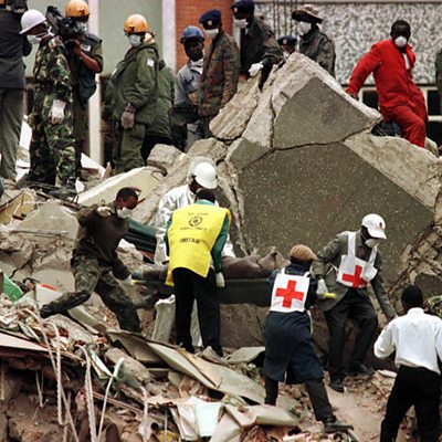 In 1998, al-Qaeda killed over 200 people in a co-ordinated attack on two US embassies in East Africa. It was one of the first major bombings carried out by the group. We hear from George Mimba who was working in the embassy in Kenya when the attack took place. Photo: Rescue workers at the scene of the Nairobi embassy bombing (AFP/Getty Images)