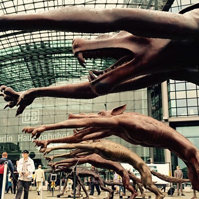 The Wolves are Back is a series of giant wolf-man sculptures by German artist Rainer Opolka. His bronze and cast iron creations are currently on display in Berlin, after been shown in Dresden and Potsdam. The pack of 66 creatures, each striking a threatening pose, is accompanied by the inscription ‘don’t feed the wolves.’ Tina is joined by the artist to discuss how his work intends to confront what he sees as the rise of racism and neo-Nazism in his home country. Irish-Canadian author Anakana Schofield responds to the changing cityscape of Vancouver and considers how the current property boom is affecting both its artistic community and her own writing. In a feature from producer Yael Even Or, artist Luciana Kaplun discusses her dramatization of an urban myth claiming Israel’s Prime Minister Benjamin Netanyahu was born in Sudan. Kaplun explains how her new film raises questions about the relationship between Africa and Israel, ahead of its screening at The Tel Aviv Museum of Art in November. Finally, writer Elin Unnes sketches a history of the Swedish dance licence - a law prohibiting dancing in unlicensed public places in Sweden- which has recently been abolished by the Swedish Parliament. Presented by Tina Daheley. (Photo: Wolf sculptures outside Berlin central station. Credit: Rainer Opolka)