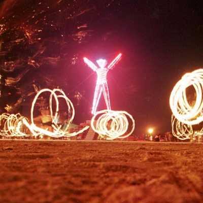 This week more than seventy thousand people are gathering in the middle of the desert in Nevada for Burning Man - part festival, part counter-culture phenomenon. This year it's the event's thirtieth anniversary - and we've been speaking to founder and Chief Philosophical Officer Larry Harvey about how they first got started. Picture: Dancers at the 1998 'Burning Man' festival create patterns with fireworks in the Black Rock Desert of Nevada just prior to burning a five-story, neon-lit effigy of a man on the last night of the week-long festival (MIKE NELSON/AFP/Getty Images)