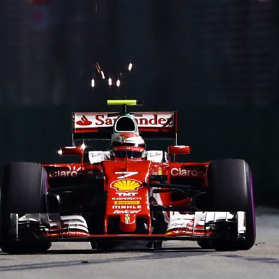 Ferrari Kimi Raikkonen overtakes Lewis Hamilton's struggling Mercedes to take third. This clip is originally from 5 live Formula 1 on Sunday, 18 September 2016.