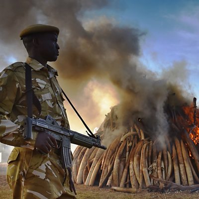 The level of elephant poaching across Africa has reached crisis proportions. Elephant populations are in steep decline and countries remain divided over what to do. The Convention on International Trade in Endangered Species, or CITES, banned the sale of ivory in 1989 during the last peak in poaching, but as elephant numbers recovered the rules were relaxed, and one-off ivory sales were allowed. At the recent CITES conference in Johannesburg campaigners blaming this legal trade for the poaching crisis were pushing hard for elephants to be given the maximum level of international protection. For Kenya this meant even more restrictions to ban all ivory trade. Countries like South Africa, Namibia and Zimbabwe wanted permission to sell existing ivory stocks in order to fund conservation. The result was deadlock. BBC Africa correspondent Alastair Leithead travels to the frontlines of the war on poachers and illegal ivory traffickers and goes inside the CITES conference rooms in Johannesburg to find out why countries can't agree on the future of the African elephant. (Photo: Solider holding a gun in front of a pile of ivory on fire. Credit: Getty Images)