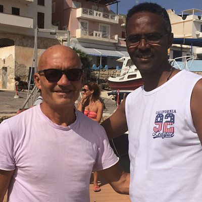 A year ago on PM Emma Jane Kirby had a series of reports on the migrants arriving on the Italian island of Lampedusa off the coast of Sicily. One report concerned an optician on the island, Carmine Menna. In 2013 he'd been on a boating holiday with his wife and friends and found himself in the middle of a massive migrant shipwreck. His boat was only ten metres long but that day they saved 47 people. Every year on the anniversary, in October, Carmine Menna and his friends return to the site with some of the survivors, to remember the people they were unable to save: 368 people drowned. (Photo: Carmine Menna and Ambasager Credit: BBC)