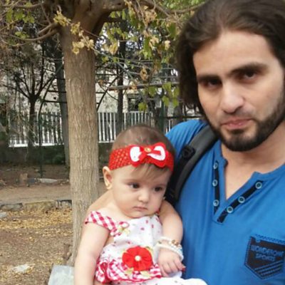 Abdulkafi Alhamdo teaches English in eastern Aleppo. Bombs go off above his classroom and shelling interrupts his lessons but he continues to teach his students. Photo: Abdulkafi Alhamdo with his daughter, Credit:Abdulkafi Alhamdo