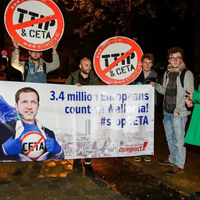 Canada has criticised the European Union after last minute talks on the CETA free trade deal collapsed, because Brussels failed to convince the Wallonia region of Belgium to give the agreement a green light. Wallonia's reluctance has prevented Belgium from signing up and the deal cannot proceed unless all 28 EU member countries consent. We hear about the merits of the transatlantic free trade deal and the basis of the objections to it, from Piter Kleppe, the head of the Brussels Office for the Open Europe Think Tank. British American Tobacco has unveiled a $47 billion takeover for its American counterpart Reynolds. If the deal goes ahead the marriage of the two would create the world's biggest tobacco company, with cigarette brands like Camel, Lucky Strike and Dunhill. Professor Nigel Driffield, from Warwick Business School in the UK, gives us his analysis of the internationalisation of big tobacco. The authorities in Venezuela have used the courts to block attempts to remove President Nicolas Maduro from office. Senior political opponents have been ordered by judges not to leave the country. They had been finalising a plan to collect millions of signatures from voters to use the constitution to oust the president. It comes as Venezuela is suffering an economic crisis, with rampant inflation and shortages of food. Hanner Dreier, from the Associated Press in Caracas, tells us more about the turmoil in Venezuela. It has been another busy week for the BBC's Business News Team keeping you up to date on developments like the fallout from the US Presidential Debate, China's growing consumer debts and the possibility that artificial intelligence could either be the best or the worst thing to happen to humanity. We reflect on the week with Jason Abruzzese, from Mashable in New York and Darren Lazarus at the Wall Street Journal in London. (Picture: Protests against the planned EU CETA trade deal with Canada outside the Walloon parliament in Namur, Belgium. Copyright AFP/Getty)