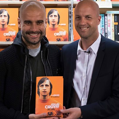 Manchester City boss Pep Guardiola remembers the first time he saw Johan Cruyff and what his impact has been on his career. Speaking to Mani Djzami, the Spaniard also reveals that he thinks of Cruyff in difficult times and blames City's defeat by Spurs on his failure to follow Cruyff's principles. Cruyff's son, Jordi, describes how his dad protected the family from criticism by Barcelona fans and journalist, and how he was able to switch from outspoken coach to loving family man. (Photo: Pep Guardiola and Jordi Cruyff promoting Johan Cruyff's autobiography, Credit: Getty Images)