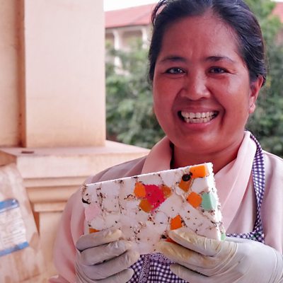 Washing your hands with soap is one of the most effective ways to prevent diseases linked to poor sanitation, but in rural Cambodia children still die from diarrhoea because of a lack of soap. Now a new source has been found – recycling the bars left in hotels by tourists. (Photo: Channy makes recycled soap from the bars left in hotel bathrooms. Credit: Eco Soap Bank)