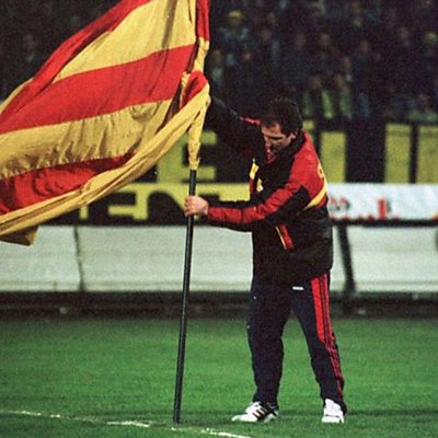 In April 1996, the manager of Galatasaray and former Liverpool star, Graeme Souness, went down in Turkish football history. After winning the Turkish Cup final, Souness celebrated by planting a Galatasaray flag in the middle of arch-rival Fenerbahce’s pitch. The Scottish manager almost sparked a riot, but won the hearts of Galatasaray supporters. Graeme Souness speaks to Cagil Kasapoglu. Photo: Graeme Souness planting the Galatasaray flag in 1996 (Turkish television)