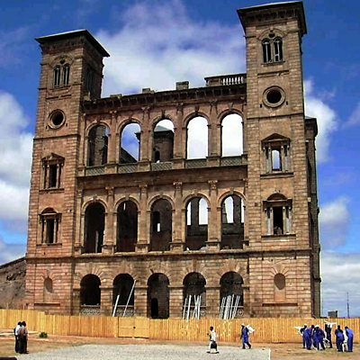 In 1995 one of Madagascar's most historic sites was destroyed by fire. The palace complex, which contains the stone clad Queen's Palace, dominates the capital Antananarivo. It is the burial site for Madagascar's kings and queens and is considered sacred by many. The destruction of the site caused widespread grief and anger in Madagascar. We hear from Simon Peers, who witnessed the devastating fire. Photo: Workers restoring the Queen's Palace which was almost entirely destroyed by a fire in 1995 (AFP/Getty Images)