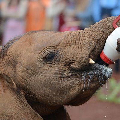 Amid the slaughter of African elephants by poachers, a Kenyan-British woman became the first to successfully hand-rear orphaned baby African elephants . As infants, elephants are dependent on their mother's milk and are extremely vulnerable. Without their mothers, orphans struggle to survive. In 1987 Dame Daphne Sheldrick worked out a formula that can keep them alive. The charity she set up, the David Sheldrick Wildlife Trust, has now raised over 200 orphaned elephants in Kenya.. Photo: Feeding time for orphaned elephants at the David Sheldrick Wildlife Trust nursery in Nairobi, Kenya (AFP/Getty Images)