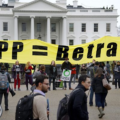 Wendy Cutler was responsible for the TPP agreement from the United States. How does she feel about Donald Trump's announcement that he will abandon it? (Photo: Activists hold a rally to protest the Trans-Pacific Partnership. Credit: Olivier Douliery/Getty Images)