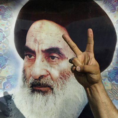 Within Shi’ism there is a high level disagreement about the role of Islam in government. Shia-dominated Iran is an Islamic republic, led by Ayatollah Ali Khamenei, a senior Islamic cleric. But the Iranian model of government - a theocratic state - is not supported by Shi’ism’s most senior Islamic cleric, Grand Ayatollah Ali al-Sistani who is based in the Iraqi city of Najaf. “Khamenei is the head of Iranian army. Sistani is not the head of Iraqi army,” explains Iraqi politician Walid al-Hilli. But, as presenter Safa al-Ahmad discovers on a visit to Iraq, Grand Ayatollah Sistani has significant influence on the way Iraq is governed. (Photo: A V-sign for victory is flashed in front of a portrait of Grand Ayatollah Ali al-Sistani. Credit: Ahmad al-Rubaye/AFP/Getty Images)