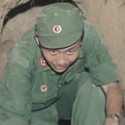 Vietnamese veteran, Le Van Lang, remembers the war in the Viet Cong's underground tunnel network in South Vietnam. A resident of Cu Chi district, 20 km north of Saigon (now Ho Chi Minh City) he helped construct the tunnels and joined the insurgency against the South Vietnamese government and their American allies. The vast tunnel network became a key base and shelter for Viet Cong guerrillas and North Vietnamese units during the war, Photo: A Vietnamese soldier in a preserved section of tunnel in the Cu Chi district, 1979 (BBC)