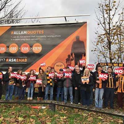 Members of The Supporters Trust gather on Anlaby Road. They talk to James Hoggarth