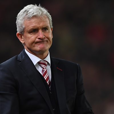 Stoke manager Mark Hughes speaks to Nigel Johnson following the 2-2 draw with Leicester.