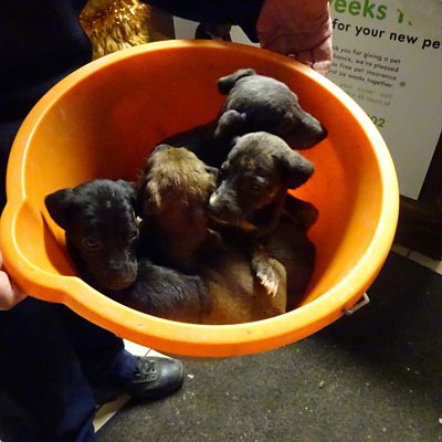 Six poorly puppies have been left in a bucket on a doorstep in Surrey. One of the five-week-old lurchers has since died. The RSPCA believes they were intended as Christmas presents but abandoned in Chobham by someone who ran away. BBC Surrey Breakfast spoke to RSPCA press officer Sara Howlett. Photo credit: RSPCA